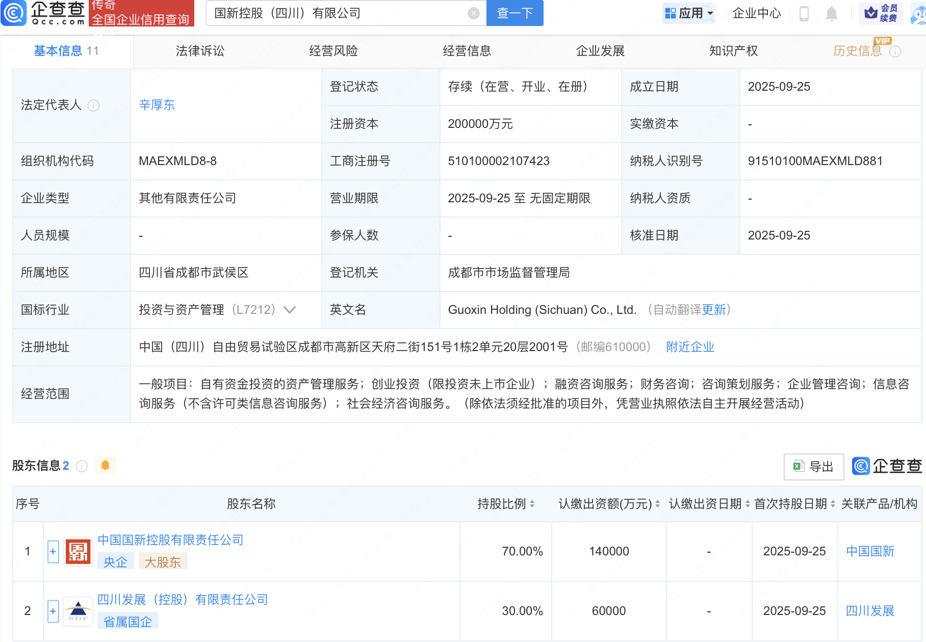 近日,国新控股(四川)有限公司成立,注册资本20亿元,经营范围包含:自有资金投资的资产管理服务;创业投资(限投资未上市企业);融资咨询服务等。企查查股权穿透显示,该公司由中国国新控股有限责任公司、四川发展(控股)有限责任公司共同持股。